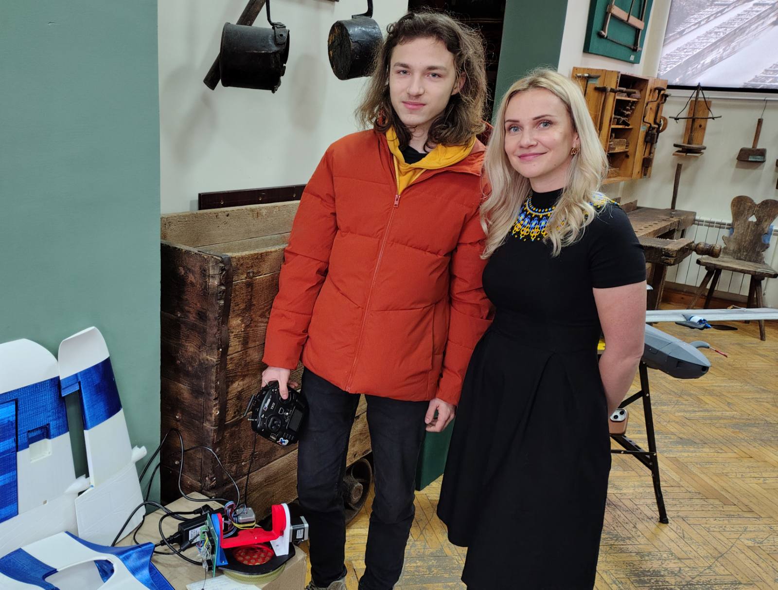 Студент групи АК-22-01 Олексій Медвідь, учасник клубу технічної творчості та робототехніки «Cyber Constructing Club» (керівник – Ігор Пронюк), представив у номінації «Авторські конструкції та креативні інтерпретації» свою нову версію проєкту під кодовою назвою «PAPUGA».